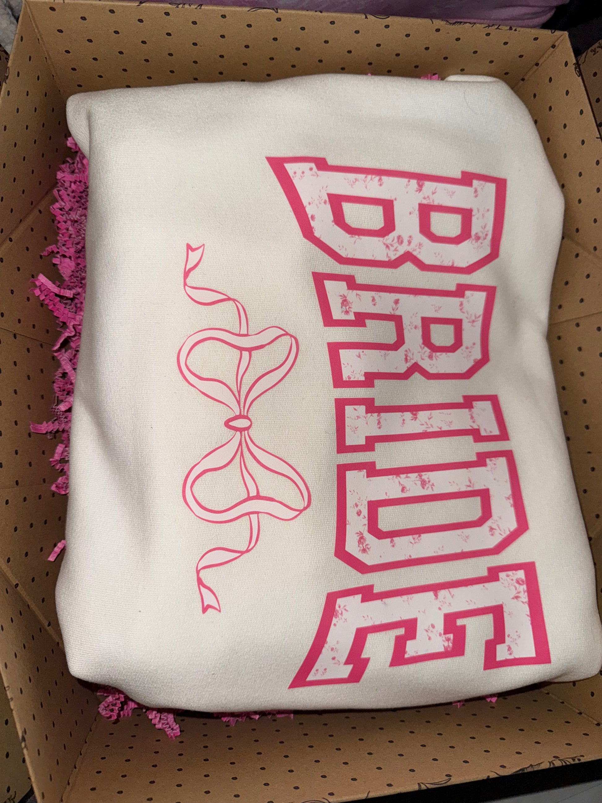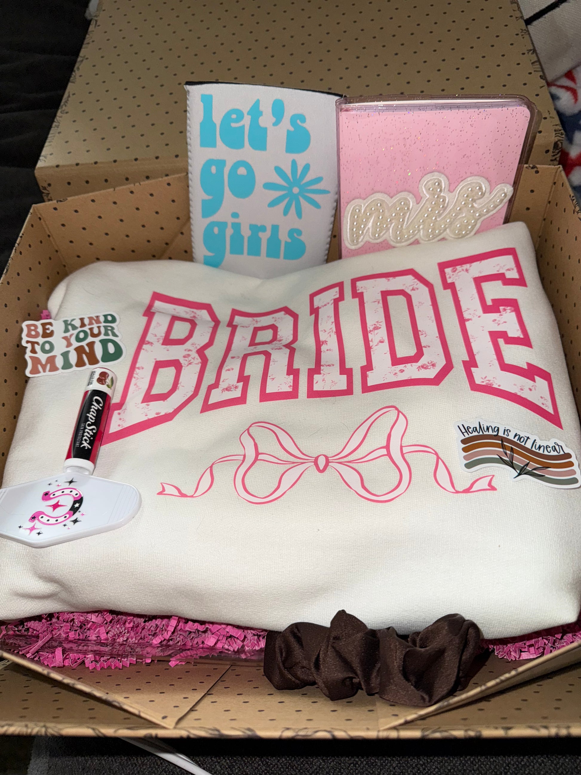 T-shirt or crewneck, notebook and pen for all your wedding plans and details, coffee cup or wine glass that has, "Mrs.", a "Mrs." koozie, chapstick, and a scrunchie or claw clip.